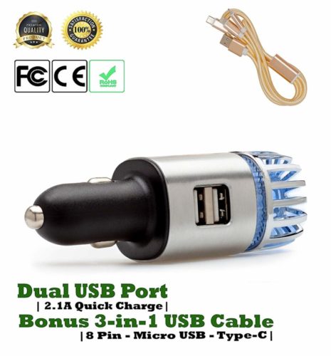 - Su potente USB de 2.1 amperios se puede utilizar como cargador para sus teléfonos o tabletas. También puede cargar su teléfono y purificar la calidad del aire de su automóvil.